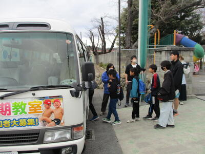 学校からスイミングスクールまでは、バスで移動です。