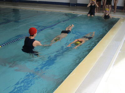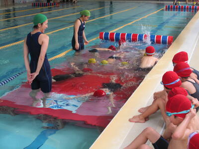 本日は、残念ながら見学となった子どもも複数いました。しかし、見学の子どもたちもプールサイドで一緒に参加し、指導の様子を真剣に見て学んでいる姿が見られました。