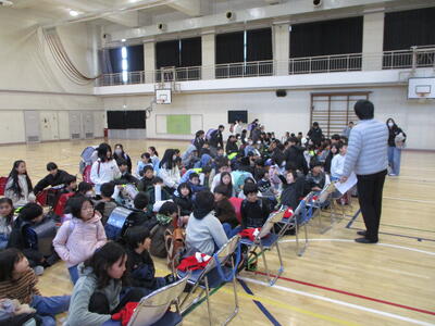 今朝は、3学期はじめての集会。〇✖クイズです。