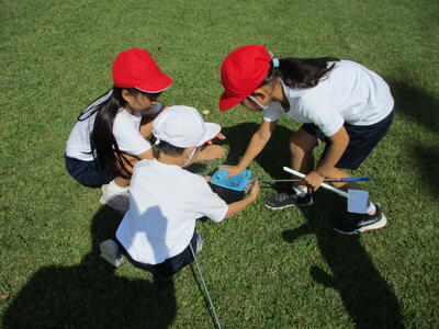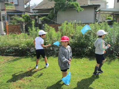 晴れた日の校庭。最近は、虫捕りをしている子どもが低学年に多くいます。