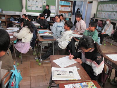 ワークシートに自分の考えをまとめ、近くの友達と意見交換。