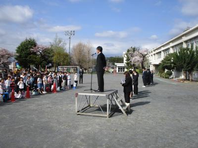 今日は、新しく来られた教職員を紹介する着任式と始業式が、校庭で行われました。